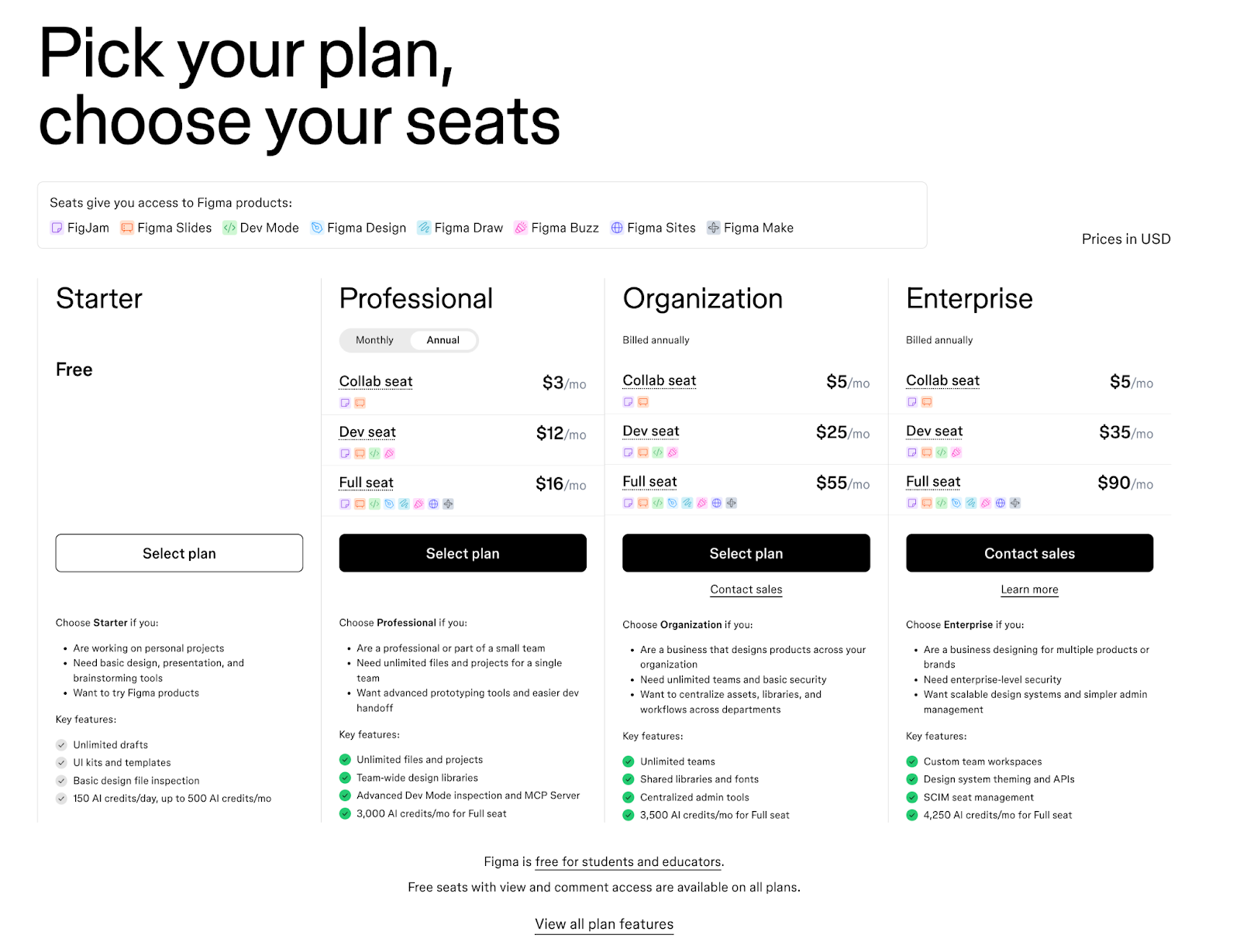 - Clear indicators showing which Figma products each seat unlocks