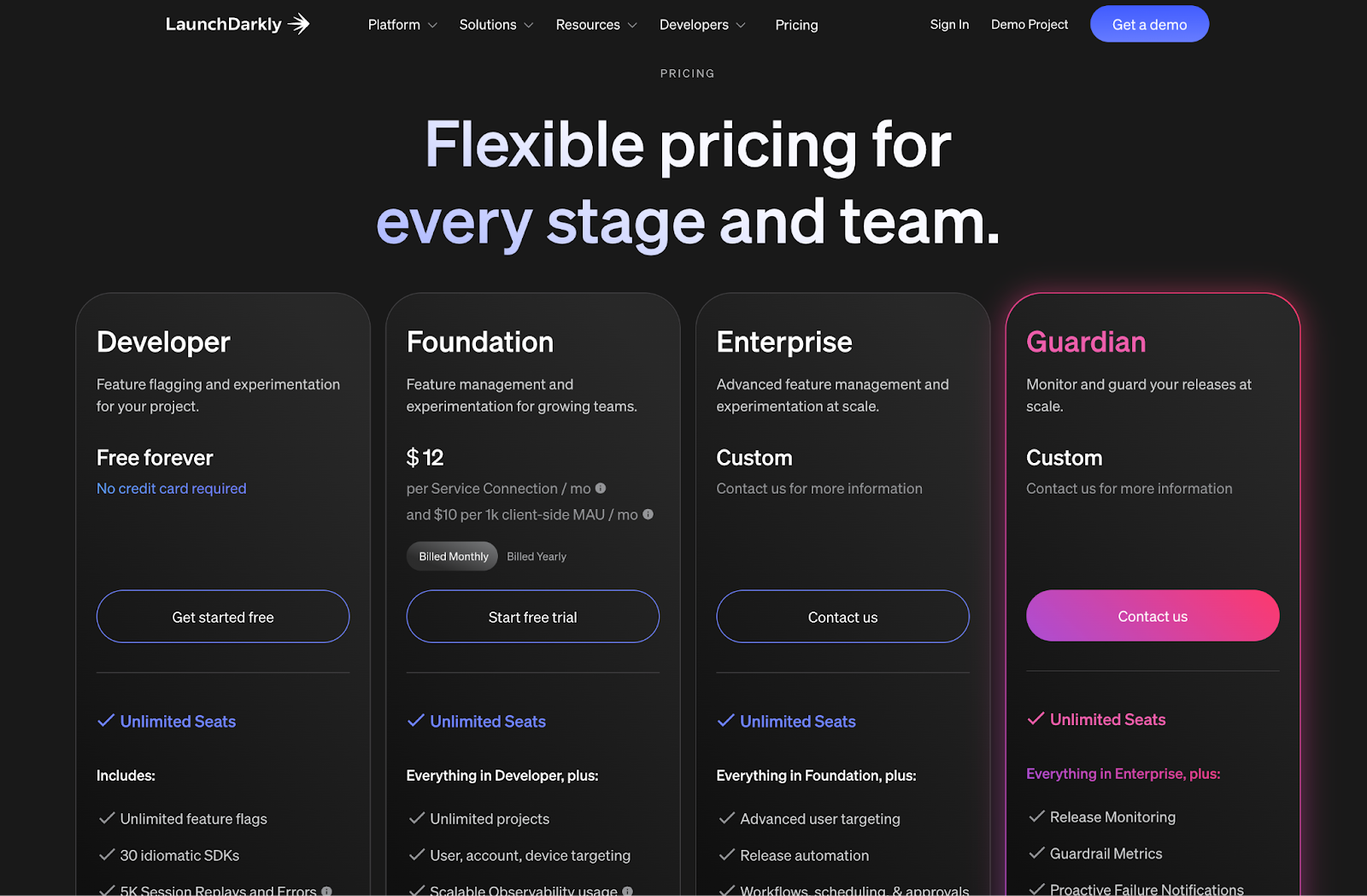 LaunchDarkly’s pricing page balances flexibility with clarity.