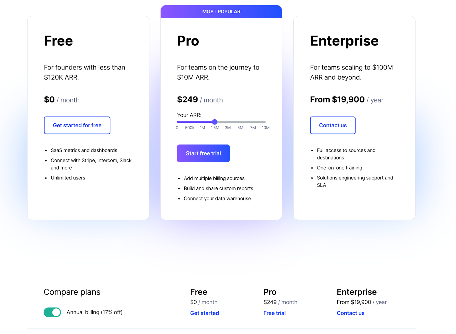 ChartMogul builds analytics for subscription businesses, and its pricing page reads like a growth roadmap. The standout is the ARR slider on the Pro plan. You drag it to your current revenue, and the pricing adjusts to match your scale. No guessing, no back-of-napkin math.