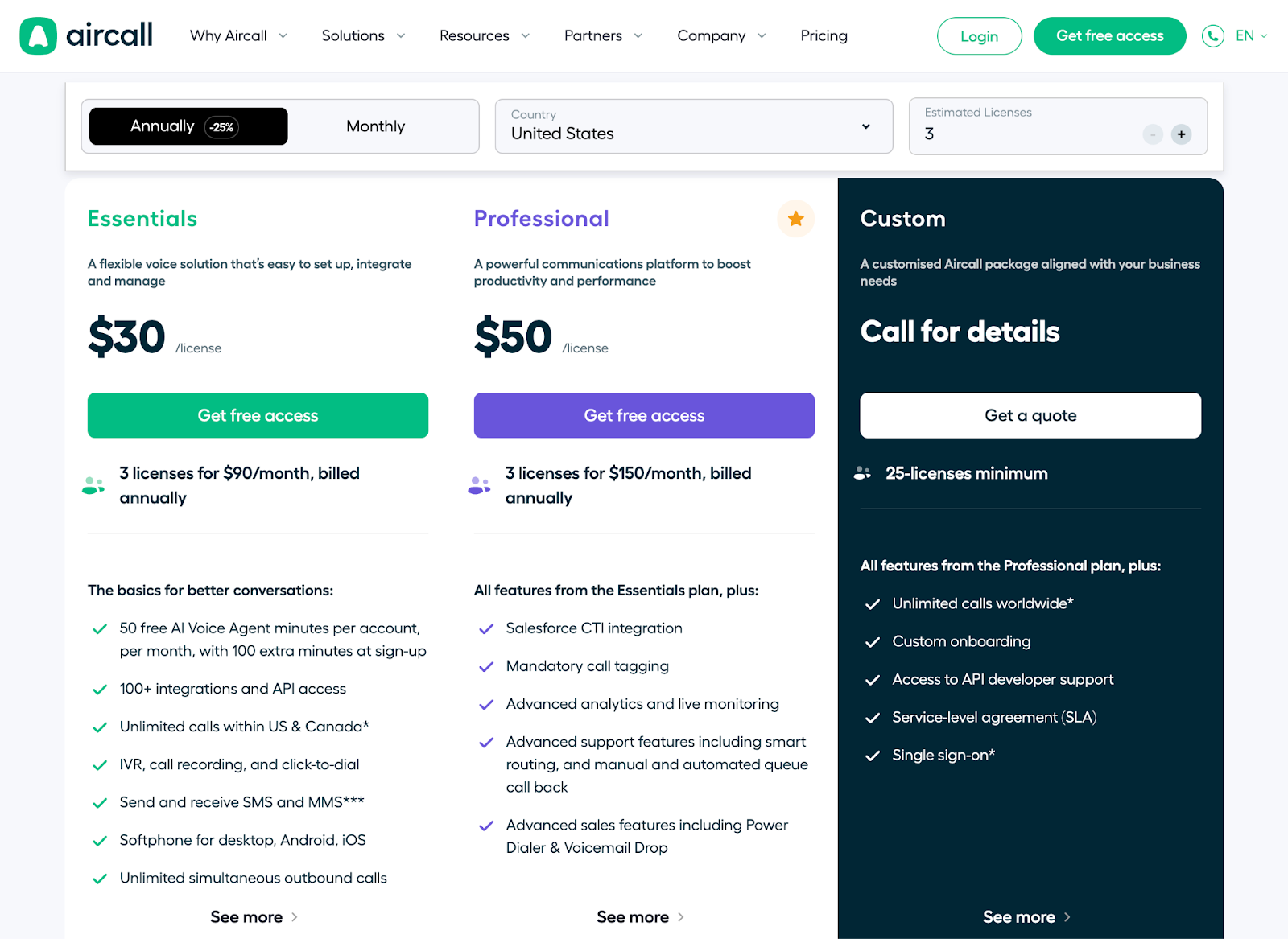 Aircall’s pricing depends on location, license count, and payment terms, which includes a lot of variables to juggle. But dropdowns, toggles, and buttons update pricing the moment you make a selection, so you're never left guessing what the final number will be.