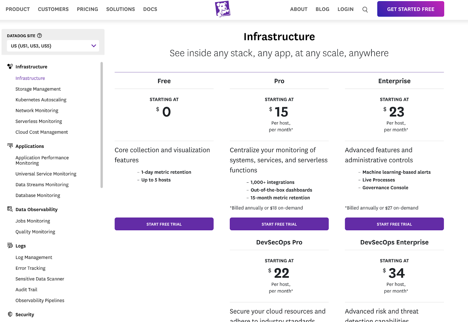 A left-hand navigation lets you filter by product category, so you're not staring at a wall of options. Each product gets its own pricing view with relevant metrics: per host, per million events, per committer. You see what you're evaluating, not everything Datadog sells.