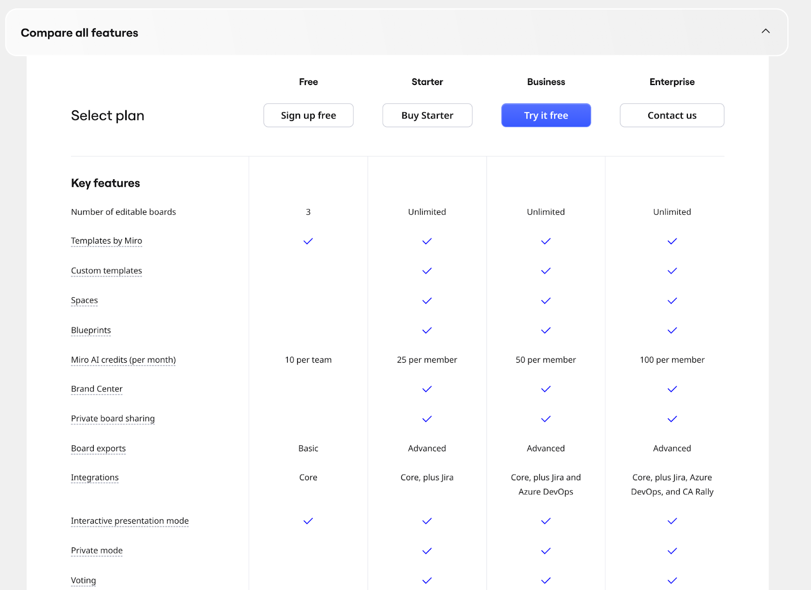 Long pricing pages can lose people fast. Miro’s pricing page runs deep, but the page organization keeps it scannable.