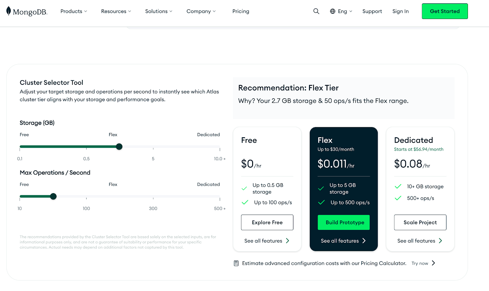 A calculator does the heavy lifting instead. You select your requirements, and the page recommends a tier with real-time cost estimates. No guesswork, no waiting on a sales call to get a ballpark number.