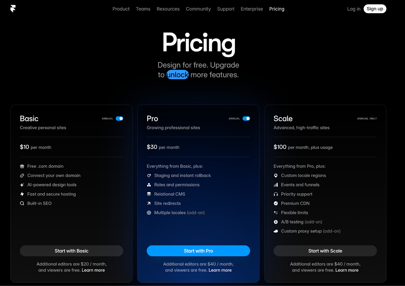 Per-seat costs, CMS items, bandwidth, form submissions. Framer's pricing page has a lot of variables to communicate.
