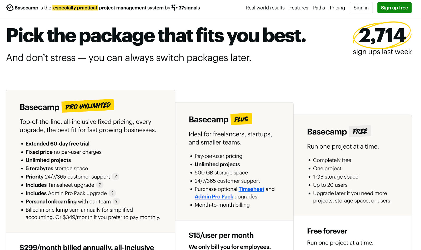 Basecamp's pricing page looks like a landing page that happens to have prices on it.